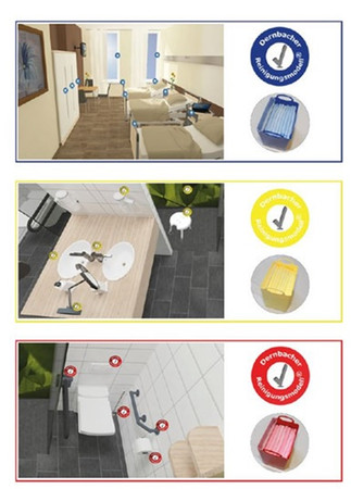 Unser Reinigungskonzept wurde in Kooperation mit führenden Fachleuten der Krankenhausreinigung entwickelt und geht zunächst von einem verblüffend einfachen Ansatz aus: Abhängig von der hygienischen Anforderung bei der Reinigung, werden drei mit den Farben Blau, Gelb und Rot markierte Bereiche unterteilt und entsprechend markiert.